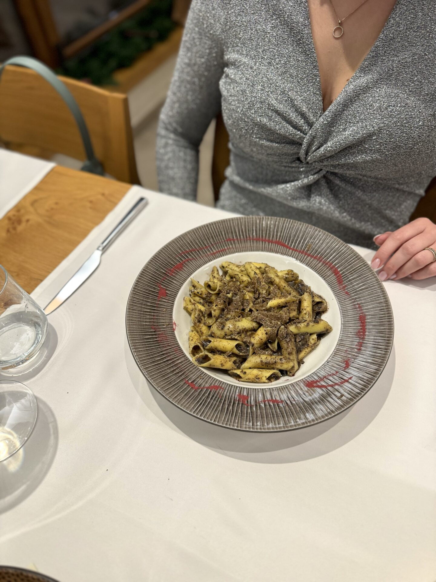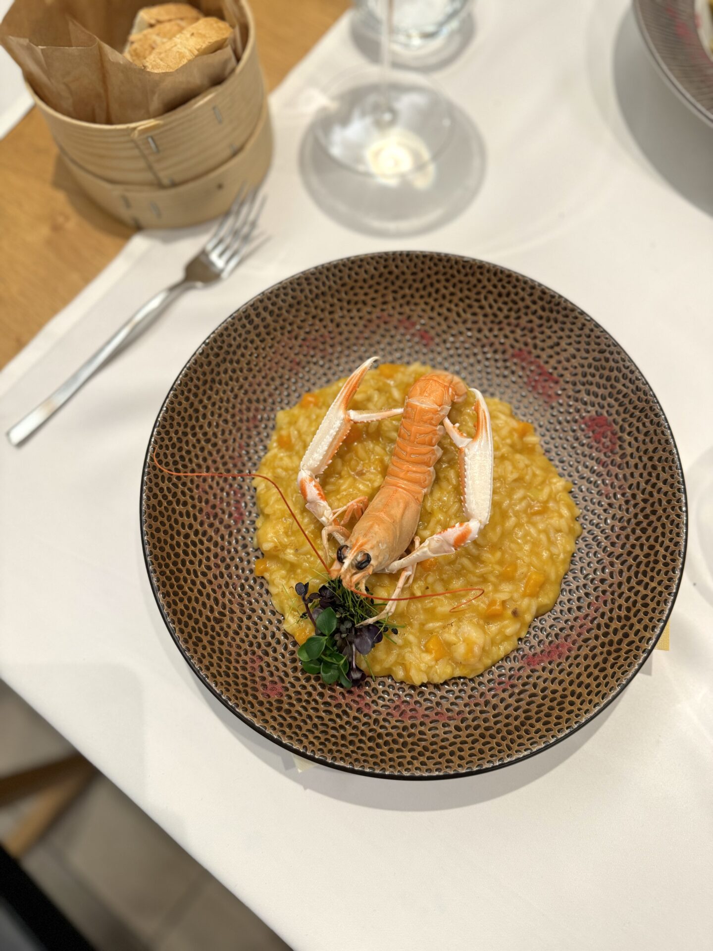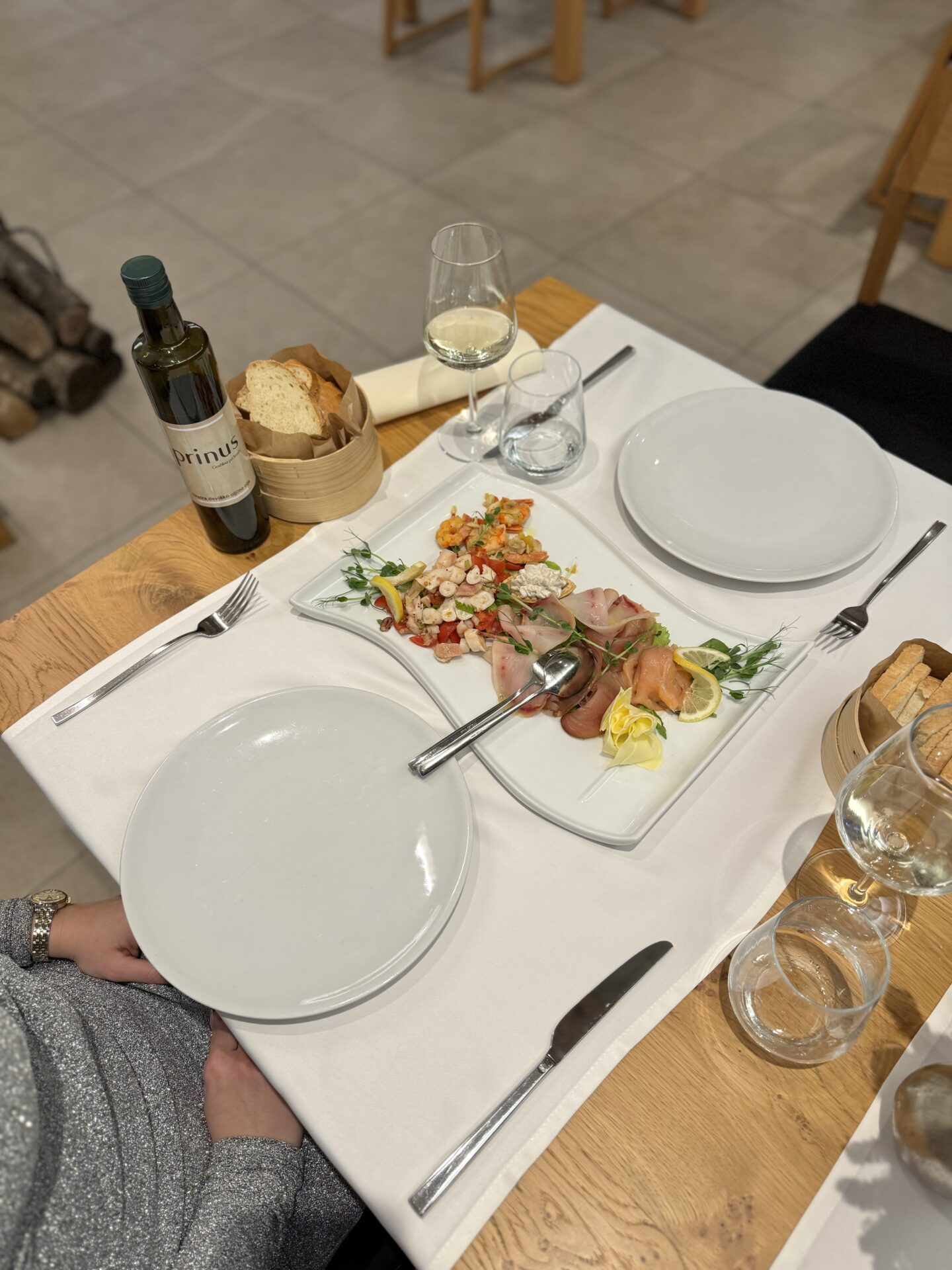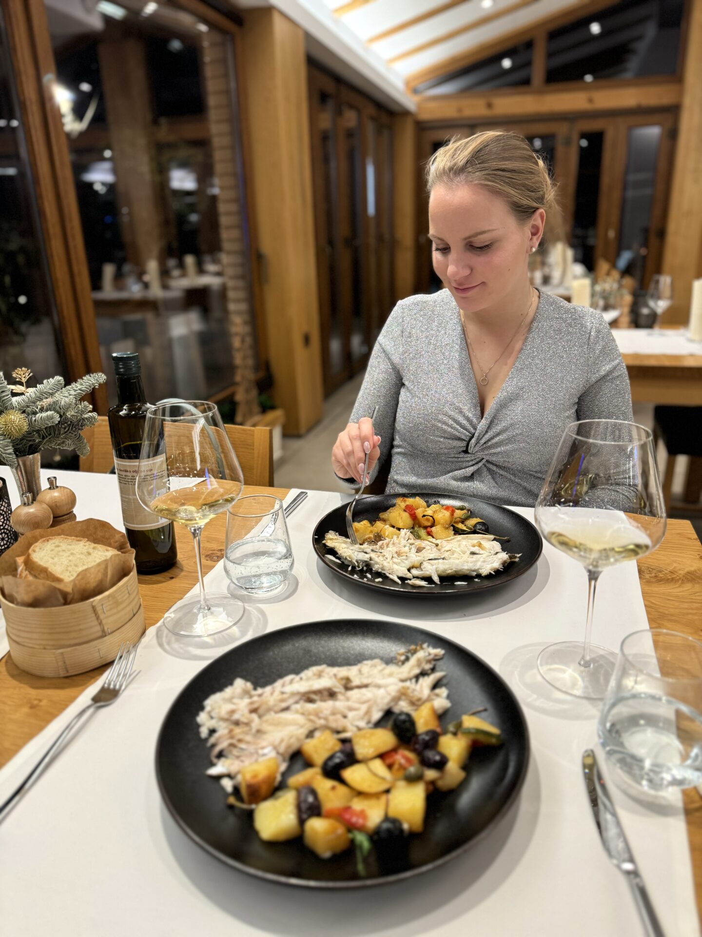Midva sva se tokrat odločila za bolj ribje obarvan meni, kjer sva preizkusila krožnik hladnih predjedi, fuže s tartufi ter rižoto z bučo in škampi, za glavno jed pa sva izbrala file brancina s pečeno zelenjavo in krompirjem.