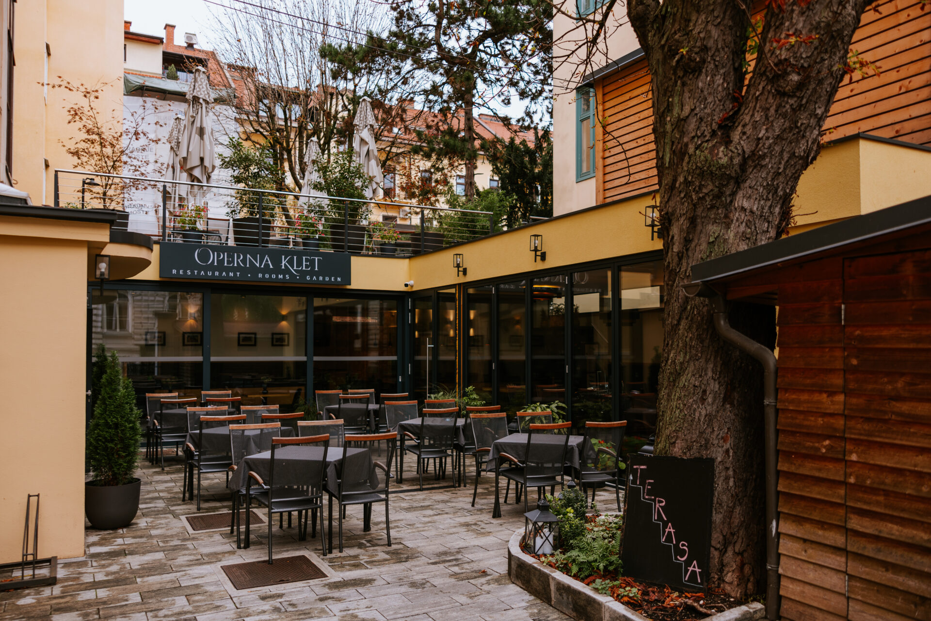 Locirana nasproti državnega zbora, lično urejena teraso z vrtom, ponujajo pa tudi hotelske storitve.